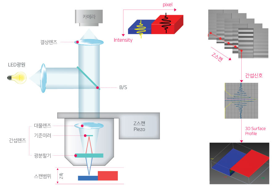 3차원 형상 측정기는 빛의 간섭을 이용해서 높이 분해능이 0.1nm로서 1nm~10mm의 표면 형상을 쉽고, 빠르고, 정확하게 나노 단위로 측정합니다. 접촉식 방식에 비해서 측정물의 손상이 전혀 없으며 공초점 방식에 비해서 렌즈 배율에 상관없이 높이 분해능이 동일하기 때문에 정확하게 측정이 가능하고 AFM 방식에 비해서 빠르고 넓은 영역의 측정이 가능합 니다.